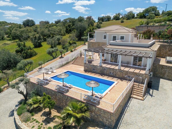 Truly relax in this unique and peacefully located villa. Situated high on a hill at the end of a private road with no nearby neighbors, yet not isolated. Enjoy spectacular views of the inland mountains towards Loulé and São Brás de Alportel. The villa features beautiful terraces spread over two levels and was recently renovated in 2024, including a heated pool with a new pool cover. Just 20 minutes to Faro Airport, 25 minutes to Tavira, and 2 hours to Seville in Spain or 2.5 hours to Lisbon. The stunning golf courses of Vale do Lobo, Vilamoura, and Almancil are 25 minutes away. The picturesque Loulé is 15 minutes away, and Fuseta with its beautiful islands and beaches is 30 minutes away. São Brás de Alportel, with all major supermarkets, is only 5 minutes away. The large Aquapark of Quarteira is 20 minutes away.