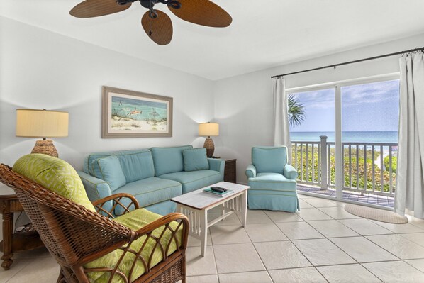 Einheit Nr. 4 Eigenschaften: Zwei-Schlafzimmer, zwei Badezimmer im zweiten Stock Einheit am Strand mit spektakulärem Strandblick. Zu den aktualisierten Annehmlichkeiten dieser Unterkunft gehören eine moderne Küche mit Granit-Arbeitsplatten, Fliesenböden in der gesamten Unterkunft, neu renovierte Badezimmer mit Granit-Arbeitsplatten, ein Dekor im Tommy Bahama-Stil und eine private Terrasse mit Blick auf den Golf. Das Master-Badezimmer bietet jetzt Spa-ähnliche Annehmlichkeiten für ein luxuriöses Gefühl. Sie können auch die LCD-Flachbildfernseher im Wohnzimmer und im Hauptschlafzimmer genießen. Einheit 4 beinhaltet drahtloses Internet für den Zugang zur Welt außerhalb des Paradieses.