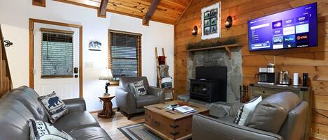 Your home away from home in Sautee Nacoochee with 4 bedrooms. This enchanting chalet offers 1 king bed, 3 queen beds, and 1 bunk bed for a wonderful stay. With 5 bathrooms featuring showers and hair dryers, guests will feel right at home. Enjoy your time in Sautee Nacoochee at our cozy chalet. We have top notch fiber wireless internet. The sky is the limit for entertaining from weddings, birthday parties to bachelor and bachelorette parties. There is plenty of room to park and we are not far from downtown Helen.