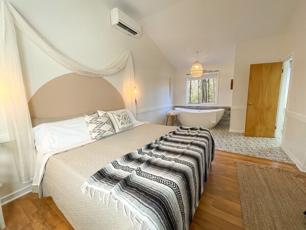 - Comfy king-sized bed with. 100% cotton sheets (Note: Mattress is firm but has a 2 inch memory foam mattress topper.)