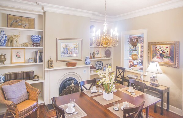 Gehen Sie nach draußen und hinunter zur Gartenwohnung mit einem Schlafzimmer und einem Vollbad, das über freiliegende Balken und zwei dekorative Kamine verfügt und der Inbegriff des südlichen vorwärmen Charmes ist. Der Wohnbereich verfügt über ein Full-Size-Schlafsofa und Kabel-TV. Hier können Sie sich bequem entspannen. Die helle und helle Wohnküche mit Blick auf den Innenhof verfügt über einen Schreibtisch, der sich perfekt für die Planung Ihres Tages eignet. Mit einer geschmackvollen Mischung aus antiken Möbeln, einem gusseisernen Queensize-Bett und einem eigenen Bad mit ebenerdiger Dusche ist das Schlafzimmer ein abgeschiedener Rückzugsort für zwei Personen.