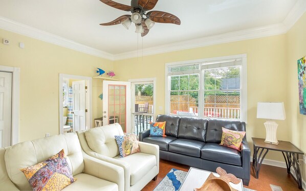 Auf der Rückseite des Hauses befinden sich ein ungezwungener Wohnraum und ein Flachbildfernseher. Eine Waschmaschine und ein Trockner sind ideal für längere Aufenthalte. Ein komplettes Bad ist bequem für Schlafsofas gelegen. Von diesem Raum aus haben Sie Zugang zu der Terrasse mit Schaukelstühlen und einem Innenhof mit großem Sitzbereich - der perfekte Ort, um Wein zu trinken und abends Wein zu trinken und den Tag mit Ihren Lieben zu erzählen.