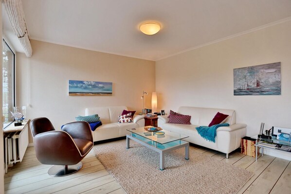 Moderne 3-Zimmer-Maisonette-Wohnung, 1. OG, in Scharbeutz, fast 100 m², mit 2 (einmal überdacht) Süd-Balkonen. Auf der unteren Ebene befindet sich eine separate Siematic-Küche mit hochwertigen Geräten und umfangreicher Ausstattung wie z.B. einer zusätzlichen Espressomaschine, Eierkocher und einer integrierten Mikrowelle im Backofen. Das großzügige Wohnzimmer (30 m²) bietet Essplatz für 6 Personen, 2 komfortable Sofas zum Relaxen, Flach-Bild-TV, DVD-Player, W-LAN sowie Radio. Auch der 15 m² große überdachte Süd-Balkon, mit Markise, lädt zum Entspannen ein; von hier kann man einen seitlichen Meeresblick genießen. Ein Tageslicht-Badezimmer mit Wanne und WC macht die Ausstattung auf dieser Ebene komplett.