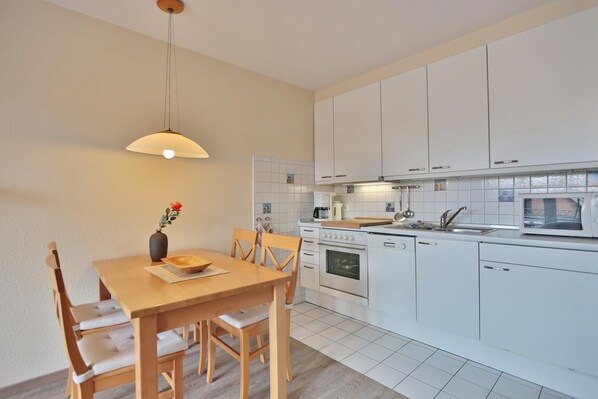 Die moderne 2-Zimmer Wohnung befindet sich in der 2. Etage mit Südbalkon und ist für 4 Personen ausgestattet. Der gemütliche Wohn- und Schlafraum ist mit einer Doppelbettcouch (Liegefläche 1,60 m x 2,0m), einem TV und einem Essplatz für 4 Personen ausgestattet. Von hier aus gelangen Sie auf den Südbalkon. Die integrierte Einbauküche ist mit Geschirrspüler, Backofen und Mikrowelle ausgestattet.