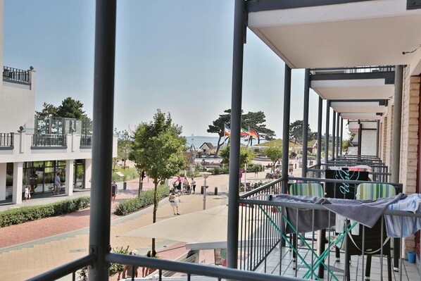 Der moderne und gepflegte Wohn- Schlafraum ist mit einer bequemen Doppelbettcouch (1,60 x 2,00 m) Flachbildfernseher, DVD-Player und Stereoanlage mit CD-Player ausgestattet. Von hier aus gelangen Sie auf den Ostbalkon mit Blick auf die Dünenmeile mit seitlichem Seeblick.