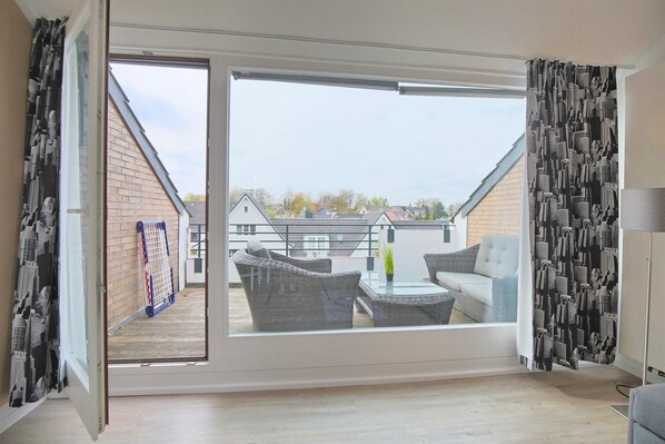 Im modernen Wohnschlafraum befindet sich ein Schlafsofa (1,80 x 2,00 m), ein Flachbild-TV sowie ein Essplatz. Die integrierte Pantry-Küche ist mit Geschirrspüler, Ceranfeld und Backofen ausgestattet. Im Flur/Eingangsbereich befindet sich ein Ikea Hemnes Tagesbett. Hier kann man sich zum Lesen zurückziehen bzw. kann hier auch eine 3. Person schlafen (eine einzelne Person, Bett verfügt über keine zweite Matratze).