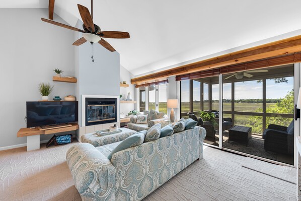 This 2 bedroom, 2.5 bath villa is beautiful! The reverse floor plan has stunning views of the tidal marsh from rooms, porches and decks! You are close to the Creekwatch neighborhood pool. The gentle ocean waves are rolling in the distance and can be heard from your deck. The Creekwatch neighborhood is located near Seabrook Island's crab dock and kayak launch - you will be surrounded by nature while staying at this lovely villa. It is a short 1.4 mile ride to North Beach where you can sit and enjoy the ocean's waves or walk to see the dolphins strand feeding. Seabrook Island's Lake House facilities are just 1.1 miles from this home. There you can enjoy using the outdoor pool (no fee) or indoor pool/fitness center (fees apply).