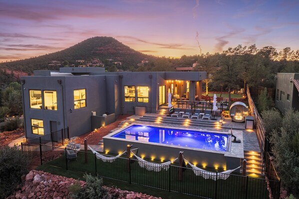 Sedona Dream Estate - 5 BR with Brand New Huge 30x15 Heated Pool with unlimited views LED Color lights and rolling safety cover located on the back patio and hot tub located off the living room patio. Free WiFi with 500 mbps download speed. Both water features have red rock Views views and more views.