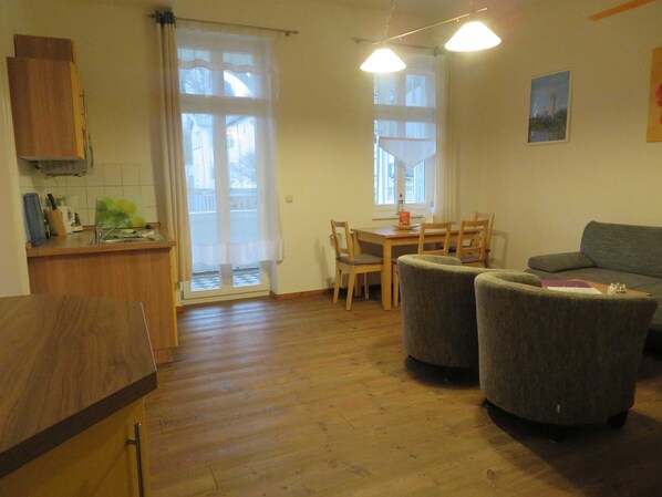 Die 2- Raum- Ferienwohnung hat ein Schlafzimmer mit einem Doppelbett und im Wohnzimmer ein Schlafsofa mit zwei weiteren Schlafplätzen. Im Wohnzimmer befindet sich die Küche mit Kühlschrank, Geschirrspülmaschine, Mikrowelle, Kaffeemaschine, Toaster und Wasserkocher. Die Ferienwohnung ist mit Kabel- TV ausgestattet und hat einen Balkon.