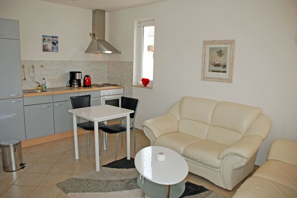 Diese modern eingerichtete Ferienwohnung liegt im Erdgeschoss, bietet auf 35 qm Platz für max. 2 Erwachsene und hat Internet WLAN. Über den separaten Eingang in Hausflur gelangen Sie in den Flur mit Garderobe und Kleiderschrank. Im gemütlichen Wohnzimmer stehen eine Polstersitzgruppe mit Tisch und Sesseln und ein Schrank mit einem modernen Flachbild-TV - Gerät. Hier steht auch ein Esstisch mit Stühlen. Die kleine Küchenzeile im Wohnbereich ist mit einem 4-Plattenkocher, Wasserkocher, Kaffeemaschine, Toaster und Kühlschrank komplett ausgestattet. Im Schlafzimmer steht ein bequemes Doppelbett (durchgehende Matratze) mit Nachttischen und Leselampen.