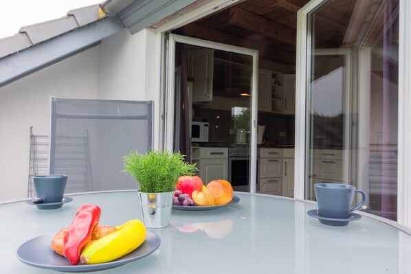 Am Haus befindet sich ein Grünbereich mit Sitz- und Grillgelegenheiten, jede Wohnung besitzt einen PKW-Stellplatz. Für mitgebrachte Fahrräder steht ein Fahrradständer hinter dem Haus zur Verfügung.