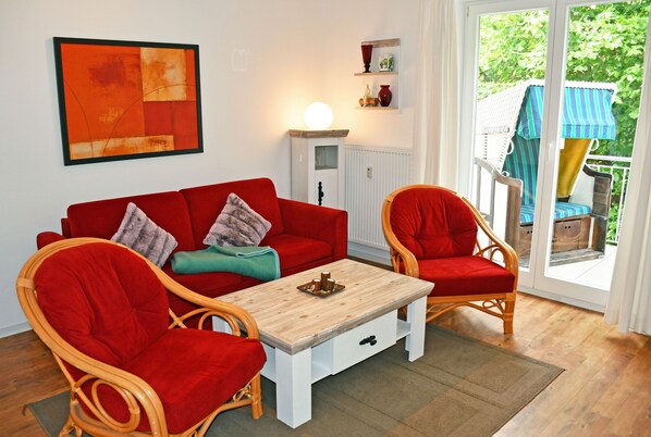 Gäste dieser Ferienwohnung können auch ein kostenloses WLAN-Internet nutzen. Im Wohnraum befinden sich eine bequeme Sitzcouch mit Schlaffunktion für 2 Gäste, Sessel und ein Tisch, ein modernes Flachbild-TV-Gerät. Hier steht auch ein Esstisch mit Stühlen.