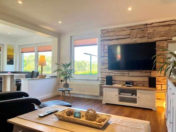 Es verfügt über einen großen Wohnraum mit SMART-TV inkl. HD+ (55 Zoll), HiFi-Alage mit CD, USB und Bluetoothfunktion und einen Bluray-Player. Die Schlafcouch bietet die Möglichkeit einer zusätzlichen Aufbettung. Eine gemütlichen Sitzecke im Eingangsbereich lädt zum Verweilen ein, von hier aus haben Sie einen tollen Blick auf Wald und Natur.