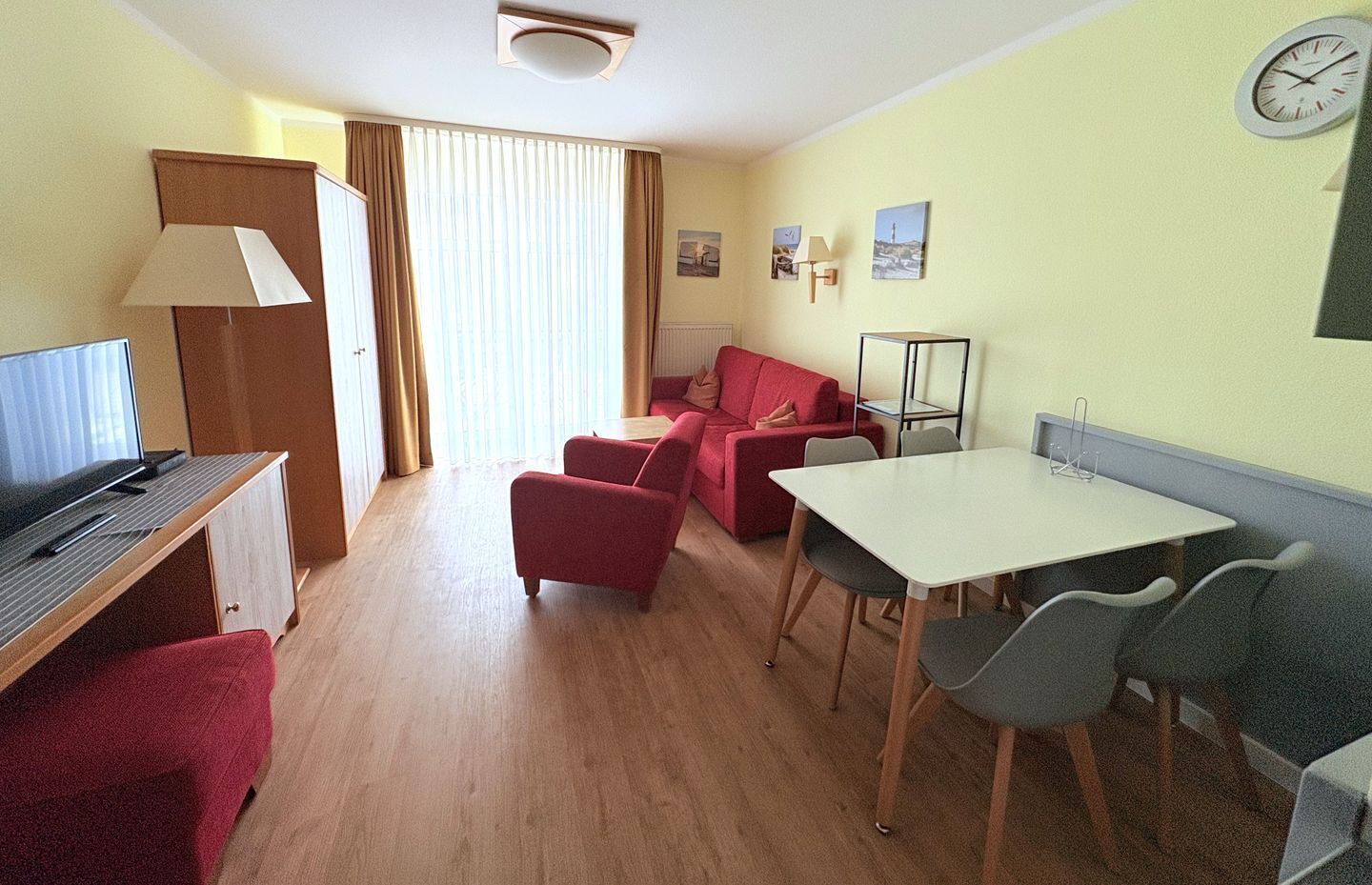 Das Herzstück der Wohnung ist der helle Wohnbereich mit einer offenen Küche. Hier steht ein gemütliches Schlafsofa bereit, das zusätzlichen Schlafplatz bietet. Das separate Schlafzimmer mit einem hochwertigen Boxspringbett, ausgestattet mit allergikerfreundlichen Federn und Daunen, sorgt für erholsame Nächte. Ein massiver Holzschrank sorgt dafür, dass all Ihre persönlichen Dinge ordentlich verstaut sind und die Räume stets aufgeräumt wirken, sodass Sie sich direkt wie zu Hause fühlen können.