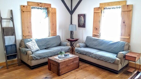 The living room, situated next to the kitchen, features a 43" Roku TV, two couches, and two comfy chairs. Leave the overhead lights on for extra lighting, or use the dimmer on the switch for a more relaxing vibe. On a chilly evening, the gas heating stove in the corner will warm you and provide the ambiance of an indoor fireplace. On a warm day, open windows provide excellent cross ventilation or you can turn on the window mounted air conditioner to really cool the space.
