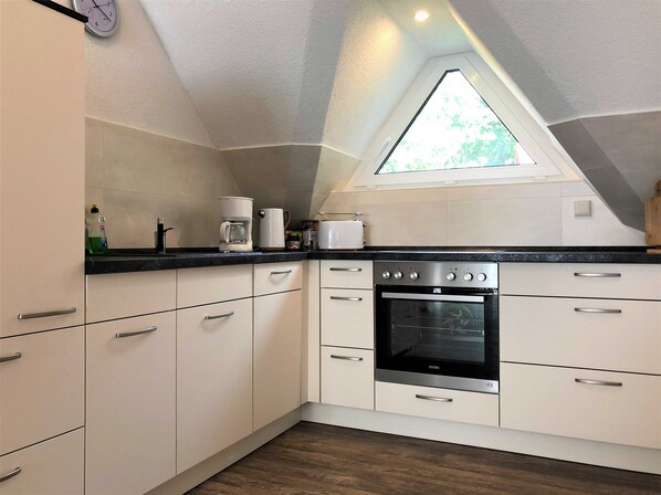 In der Ferienwohnung findet der Gast einen separaten Schlafraum, 1 kombinierten Wohn - Schlafraum mit TV, 1 Küche (komplett ausgestattet mit Backofen, Elektoherd, Geschirrspüler und Kühlschrank sowie Kaffemaschine, Wasserkocher und Toaster), die offen zum Wohnraum ist und ein Bad mit Badewanne und DU/WC.