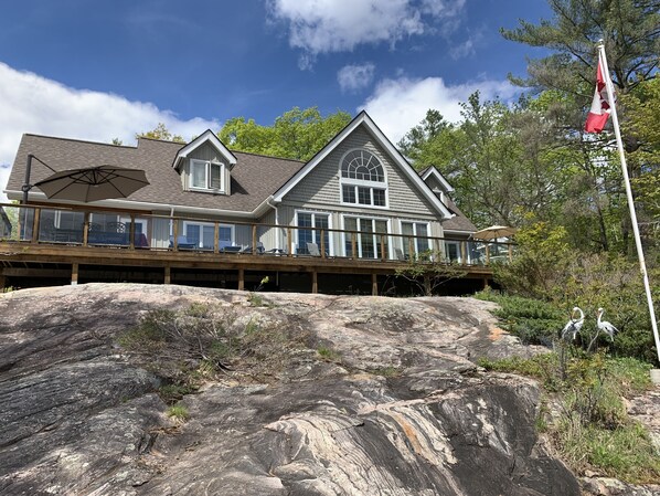 Grand room with a fireplace, open concept kitchen, sunroom, huge deck, BBQ, dock, beach, canoeing, kayaking, fishing and fire pit.
