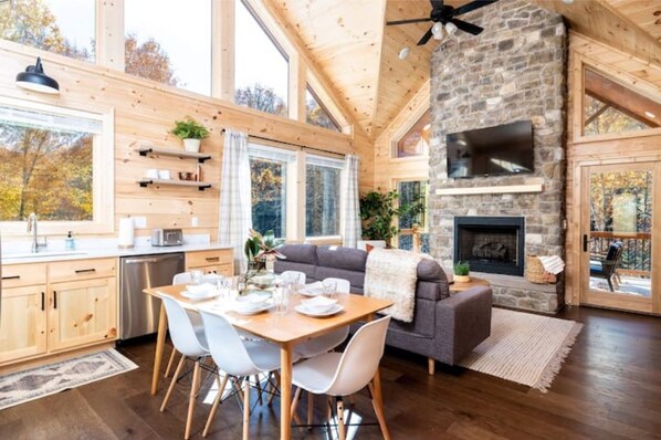 Directly behind the sofa is more seating - the dining table with room for 6 to gather and perhaps celebrate a special occasion or just enjoy each other’s company for snacks and meals. And the adjacent kitchen is where you can prepare those refreshments in style. Like the rest of the cabin, it’s packed with the brand new, including a large fridge/freezer, oven and stovetop, microwave and dishwasher. Plus all the cookware and utensils. And because it’s all part of an open concept space, whoever’s making the snacks and meals needn’t miss out on what’s going on in the living area.
