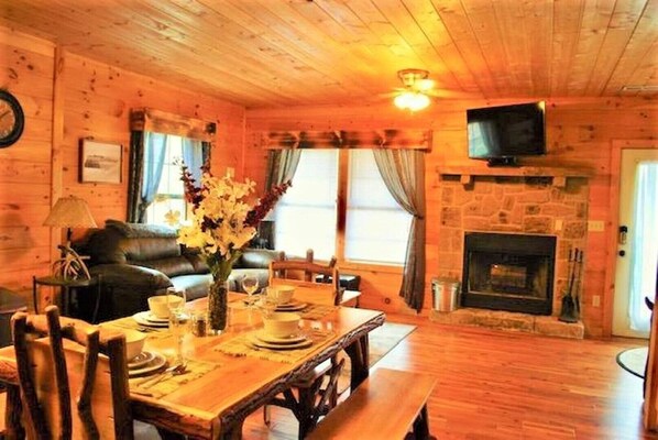 Whispering Creek Cabin bietet all Ihre Urlaubsbedürfnisse, einschließlich einer voll ausgestatteten Küche, einem Essbereich, Grillmöglichkeiten im Freien mit Utensilien, intelligenten Fernsehern und Brettspielen. Das Hauptschlafzimmer verfügt über eine romantische Innen-Whirlpool-Badewanne, ein Kingsize-Bett, einen privaten Holzkamin, einen Smart-TV und Zugang zum Deck mit einem neuen Whirlpool, um in der frischen Bergluft zu entspannen. Das Wohnzimmer im Erdgeschoss bietet ein Schlafsofa, einen Smart-TV, einen Holzkamin und eine lange Außenterrasse mit Holzwippen. Einfache Zufahrt mit Platz für mehrere Fahrzeuge neben unserem eigenen sanft plätschernden Bach.