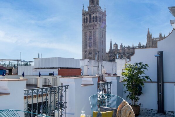 The building is located in the heart of Seville, just steps from the Cathedral and just minutes from the Santa Cruz neighborhood. It features a shared terrace with views of the Giralda and a pool for you to enjoy under the Sevillian sky. The apartment has everything you need to make your day in Seville an experience. Featuring a bedroom with a 1.80m double bed and a full bathroom with amenities, the apartment also has a flat-screen TV, air conditioning/heating, Wi-Fi, a Bluetooth speaker, towels and sheets, a hairdryer, an iron and board (common area), a ceramic hob, a refrigerator, a Nespresso coffee machine, a microwave, kitchen utensils, an electric kettle, a toaster, a clothes rack and hangers, and a first-aid kit.