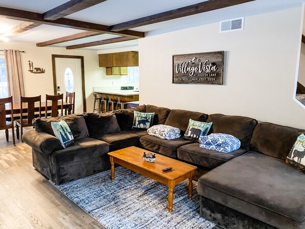 3-level cabin sits on a hillside overlooking Tollhouse Road, directly across from the Hungry Hut in the village of Shaver Lake. 2,200 square feet equipped to suit the needs of your family and large enough to host multiple families.