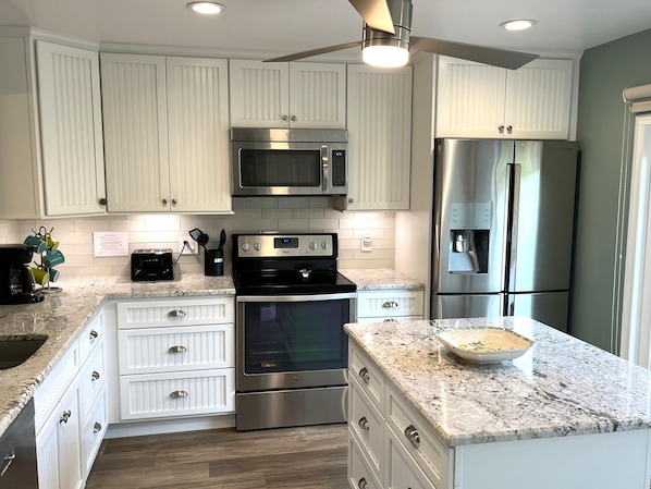 Our House at the Beach features a generous bi-level layout with separate dining and living room spaces, making it perfect for family gatherings or entertaining friends. The eat-in kitchen is fully stocked with pots, pans, dishware, and flatware, and it includes full-sized appliances such as a dishwasher, microwave, and washer and dryer for your convenience.