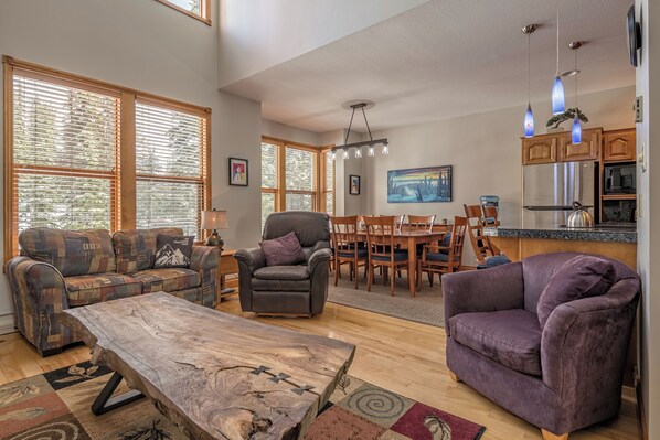 Moderne, offene Küche mit Esszimmer und ein großes Wohnzimmer mit hoher Decke. Die Hauptebene Höhle enthält ein weiteres T. V.