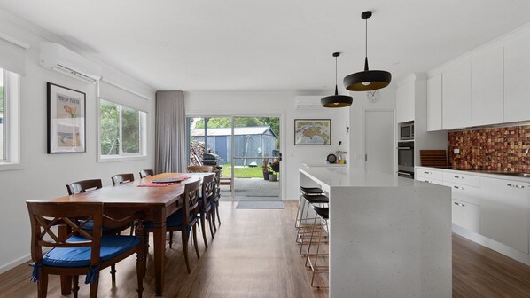The open plan living area has plenty of seating at the dining table and the kitchen is well equipped with all you would need to cook for the family.