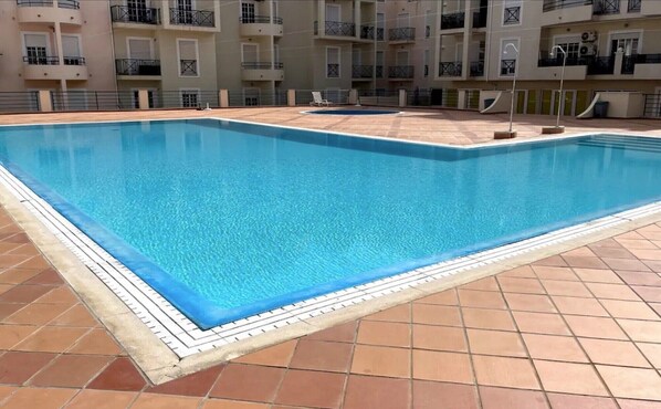 Diese Unterkunft bietet Zugang zu gemeinsamen Außenanlagen, darunter ein Pool, ein Kinderpool, eine offene Terrasse und eine Außendusche.
