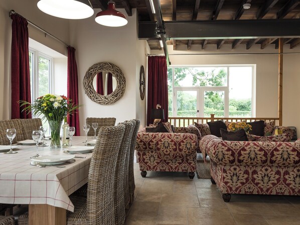 Wohn- / Esszimmer: Mit 65 "-Freeview-Smart-TV, DVD-Player, Bluetooth-Stereo-Lautsprecher und Fliesenboden.