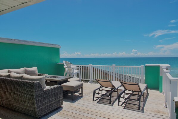 Up on the Roof was the perfect place for our family reunion 2 weeks ago. We rented both sides, and the layout is great for big meals and gatherings, but also has many nooks and crannies to get away from the crowd. The covered porches provided wonderful spaces to enjoy board games during a rain shower and the open benches halfway down the walkway were the perfect place for a cup of coffee overlooking the beach. Amy was great to work with - she kept us well- informed about the post-hurricane repairs, and also responded immediately when the AC in one of the units wasn't working well. Kitchens were well-stocked and we prepared most meals there and ate in. Everything was exactly as described and we would absolutely rent it again!