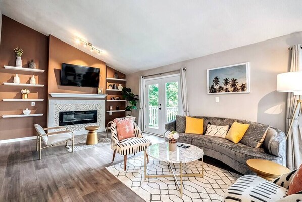 Large living area with electric fireplace with remote and furnished with a velvet couch & 4 accent chairs, 1-floor lamp, 2 tables, and Smart TV with remote.