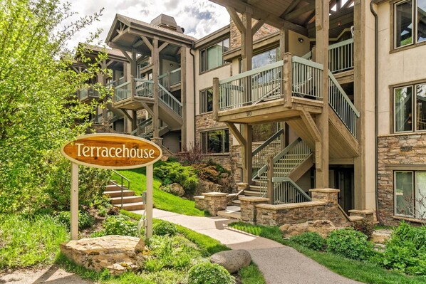 One of the best reasons to stay at Terracehouse is the access to top-tier amenities: the heated outdoor pool, hot tub, fitness room, sauna and steam rooms at the Stonebridge Inn, just next door to Terracehouse. Guests love the ability to have hotel-like amenities when staying in a vacation rental. A grotto like hot tub is located right on site at the Terracehouse along with a common area grill, ski gear storage at your door, and free summer parking (winter parking at modest daily rate) all add extra convenience.