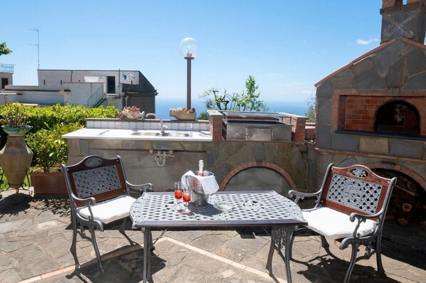 Das Apartment ist sehr hell und geräumig und besteht aus 3 Schlafzimmern, 2 Bädern und einem Esszimmer mit einer voll ausgestatteten Küche, in der Sie alles finden, was Sie zur Selbstverpflegung während Ihres Aufenthalts benötigen. Auf der Außenterrasse können Sie Ihre Mahlzeiten unter freiem Himmel genießen und sich auf den Liegestühlen sonnen. Dank des hölzernen Baldachins haben Sie die Möglichkeit, jederzeit einen erfrischenden Schatten zu genießen. Es gibt auch einen Holzofen (nur zur Vorführung) und einen Grillplatz, in dem Sie köstliche Gerichte der Region zubereiten können.