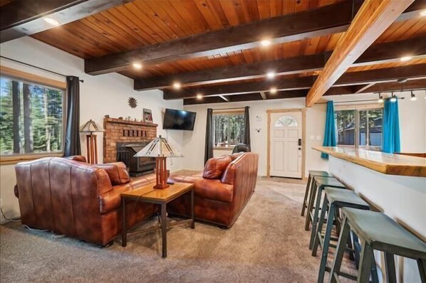 Escape to this charming 3-bedroom, 2-bathroom cabin nestled in a peaceful forested neighborhood in South Lake Tahoe. Just a short drive from the crystal-clear waters of Lake Tahoe and world-class ski resorts like Heavenly, Kirkwood, and Sierra, this 1,584 sq. ft. retreat is perfect for families or groups up to 8. With a cozy living space, Smart TVs, a fully equipped kitchen, and a spacious deck, you’ll enjoy comfort and convenience year-round. Experience the best of Tahoe’s outdoor adventures and relaxation! Here’s a closer look at the inviting spaces you'll enjoy during your stay:
