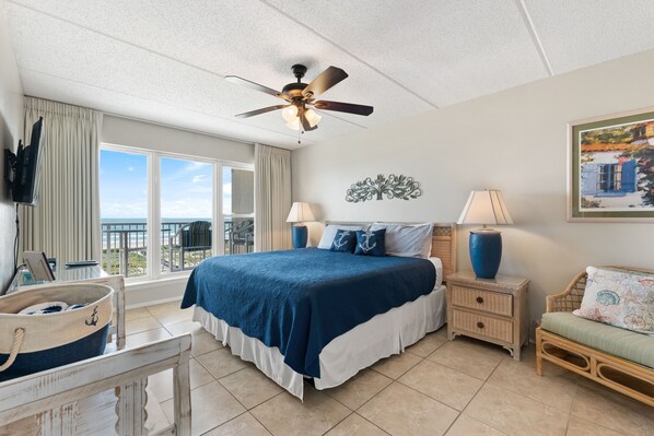 Wachen Sie jeden Morgen mit dem außergewöhnlichen Sonnenaufgang über dem Golf von Mexiko auf, während Sie gemütlich unter der Decke des Kingsize-Bettes im Hauptschlafzimmer sitzen. Packen Sie Ihre Sachen in die Kommode mit 6 Schubladen und den geräumigen Schrank aus. Beenden Sie Ihren fantastischen Tag, an dem es unter der Decke begann, während Sie eine Show auf dem Flachbildfernseher sehen.