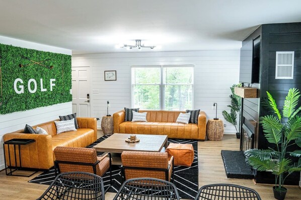 The Bogey Bunks sits on 1.9 private acres with no HOA, is equipped with 2 Game rooms, 5 Bedrooms hosting 14 Beds, 3 Full Bathrooms, a Kitchen stocked for 20, and indoor and outdoor dining opportunities.
