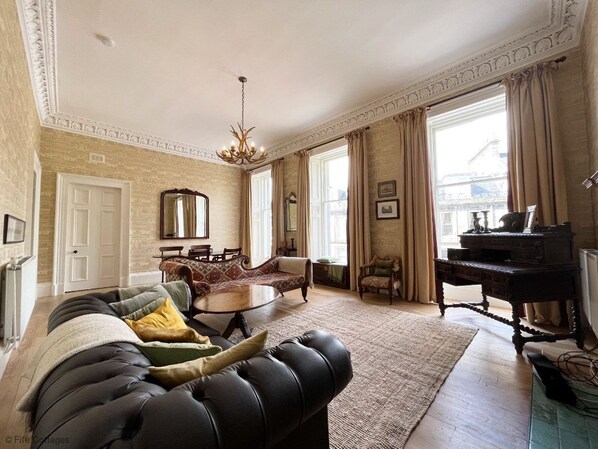 To the left lies the large and impressive living room with its views out over the surrounding properties and gardens. This room would have been the original Drawing Room of the house and continues to convey a feeling of Victorian grandeur and has been tastefully decorated and furnished. There is a Smart flat screen TV with access to BT TV and a full Sports Package. One of the apartment's two twin bedrooms is located off the living room.
