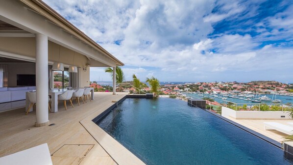 Villa Prestige is centrally located, allowing guests to walk in Gustavia and enjoy shops, restaurants and strolls around the harbour. Newly built and tastefully decorated in a both minimalist and elegant style, Prestige is a spacious property with a large, open and comfortable living room facing the panorama over the ocean and the harbour. White and cream-colour hints create a bright atmosphere perfect for relaxing. The indoor dining room can accommodate up to six guests around the beautiful white table for meals prepared in the lovely well-equipped kitchen. You may prefer to dine alfresco around the outdoor dining table for eight guests in the gentle island breeze, enjoying the exceptional light of St. Barths.