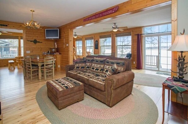 Wir lieben unser Seehaus und möchten anderen das gleiche supercoole Erlebnis bieten. Erleben Sie ein sehr hochwertiges, authentisches Kabinendekor, einen offenen Grundriss, astige Blockmöbel und Akzente an der Kiefernwand. Das Deck ist umlaufend und riesig. Fischen Sie vom Dock aus in der Sandstrandbucht oder bringen Sie Ihr Boot mit und treiben Sie Wassersport auf dem See. Auf der Hauptebene sind alle riesigen Fenster rund um Sie gewickelt. Seeblick aus 27 von 31 Fenstern. Granit & Doppelofen in der Küche.