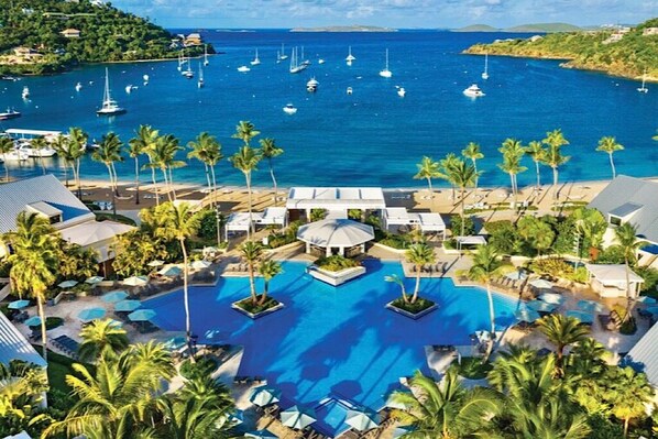 Villa unit number 1120 at this breathtaking resort is located along the tempting white beaches of Great Cruz Bay in tranquil St. John USVI. Its lush surroundings, friendly atmosphere, incomparable water excursions and charming shopping district make a stay at The Westin St. John Resort Villas the perfect Caribbean escape. This 2-bedroom Sunset Bay villa comfortably accommodates up to 8 adults. Closest villas to beach and pool. Fully equipped kitchen, washer/dryer, generous living & dining room areas, private balconies with ocean views, and complimentary Wi-Fi. Onsite dining. Nearby grocery shopping and restaurants. The second floor end unit has a vaulted master bathroom ceiling which is very spacious.