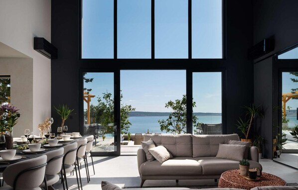 Schon beim Eintreten beeindruckt der großzügige Wohnbereich der Villa Beatrice mit seiner offenen Architektur, den hohen Fenstern und dem atemberaubenden Blick auf das Meer. Edle Materialien, sanfte Farben und modernes Design verleihen dem Raum eine elegante Atmosphäre. Egal ob Sie Ihre Lieblingsserie streamen, die neusten Hits der Charts hören oder entspannt plaudern – hier schalten Sie schnell in den Urlaubsmodus. Verbringen Sie gemeinsame Abende im stilvollen Essbereich bei selbstzubereiteten Mahlzeiten und mit einer guten Flasche Wein.