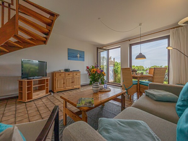 In einer der fünf schöne Ferienwohnungen im Reihenhaus wohnen hinter dem eingerückten Rosenwall an der Dorfstraße nur unweit vom Meer entfernt. Die Ferienwohnung Strandläufer für bis zu 4 Personen (plus 1 Kleinkind) bietet viel Raum zum Wohlfühlen und Entspannen.