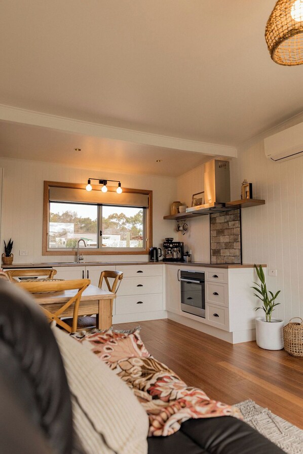 The heart of Bay Hideaway is its open-plan kitchen, dining, and lounge area, seamlessly connected and filled with natural light. With a smart TV and easy access to the front deck, it’s the ideal spot for relaxed mornings and laid- back evenings. The bathroom is sleek and modern, featuring underfloor heating and a spacious walk-in shower – an indulgent touch for your stay.