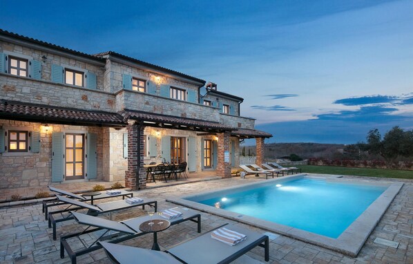 Die rustikale Villa Semper befindet sich in Istrien, genauer gesagt in der Stadt Sv. Lovreč ist ein wahres kleines Paradies auf Erden. Diese 2009 erbaute und 2022 komplett renovierte Villa bietet allen Gästen, die dem geschäftigen Alltag entfliehen möchten, einen schönen Urlaub. Gönnen Sie sich gemeinsam mit Ihrer Familie und Ihren Freunden einen perfekten Urlaub, an den Sie sich noch lange erinnern werden! Die Villa Semper bietet Platz für maximal 8 Personen, die in 4 Schlafzimmern mit angeschlossenen Badezimmern untergebracht werden. Ein Schlafzimmer mit einem Doppelbett (180x200) befindet sich im Erdgeschoss, während sich die restlichen drei Zimmer im Obergeschoss befinden. Zwei Schlafzimmer verfügen über ein Doppelbett und das dritte Zimmer über 2 Einzelbetten (90 x 200), die zu einem Doppelbett zusammengestellt werden können. Drei Badezimmer verfügen über eine Badewanne und das vierte über eine Dusche. Im ersten Stock gibt es außerdem einen Balkon mit Sitzgelegenheiten und einem kleinen Tisch, wo Sie Ihren Morgenkaffee genießen oder Ihr Lieblingsbuch lesen können. Im Erdgeschoss genießen Sie die Zubereitung von Speisen in einer schönen und voll ausgestatteten Küche und im Wohnzimmer können Sie sich auf zwei Sofas ausruhen und mit Ihren Liebsten gesellig sein. Außerdem gibt es zwei Sessel, zwei Tische, einen Fernseher und einen Kamin. Im Wohnzimmer gibt es außerdem einen Tischfußball und einen Ausgang zur Außenterrasse. Direkt neben dem Wohnzimmer befindet sich das Esszimmer mit einem Esstisch für 8 Personen. Eine angenehme Erfrischung finden Sie an heißen Sommertagen im 32 m² großen Swimmingpool mit einer Tiefe von 1,5 Metern. Neben dem Pool befindet sich eine Liegewiese mit 8 Liegestühlen, wo Sie die Sonnenstrahlen genießen und einfach entspannen können. Außerdem gibt es auf der Terrasse einen Holzkohle- oder Holzgrill im Freien und am überdachten Esstisch können Sie die zubereiteten Speisen probieren. Zu den weiteren Einrichtungen, die Sie während Ihres Aufenthalts nutzen können, gehören eine Waschmaschine, ein Bügeleisen, ein Futterautomat und ein Babybett. Der Innenhof der Villa Semper ist umzäunt und bietet 3 private Parkplätze. Attraktionen und lokale Aktivitäten in der Nähe sind Weintouren, Wassersport, ein Aquapark, der besonders die Kleinsten begeistern wird, der Skilift Poreč, Radfahren und vieles mehr! St. Lovreč ist ein verstecktes Juwel und eine der am besten erhaltenen mittelalterlichen Festungsstädte in Istrien. Geben Sie sich dem Charme Istriens hin, probieren Sie köstliche gastronomische Gerichte und Weine und fühlen Sie sich wie ein König in der Villa Sempre! Willkommen! Haustiere sind in dieser Unterkunft nach Ermessen des Eigentümers oder gegen eine Gebühr gestattet.