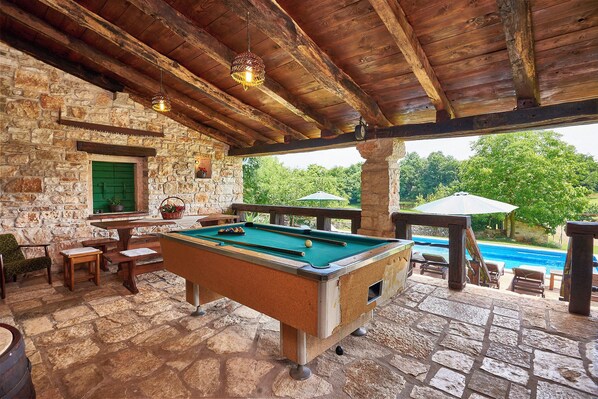 Haus für 6-8 Personen: ca. 113 m2 auf zwei Etagen. Im Erdgeschoss ein Schlafzimmer mit Doppelbett und einem Zusatzbett (90 x 190 cm), ausgestattet mit Klimaanlage. Dusche/WC, überdachte große Loggia mit komplett ausgestatteter Küche, LCD SAT-TV, Billardtisch und offenem Kamin. In der ersten Etage (Eingang von außen über die Terrasse) große Wohnküche mit Essecke, Klimaanlage und offenem Kamin. Eine steile Treppe führt auf die Galerie mit zwei Einzelbetten (je 140 x 190 cm). Ein weiteres, neu eingerichtetes Zimmer befindet sich im Erdgeschoss des Hauses Ihrer Gastgeber, ca. 10 m vom Haupthaus entfernt. Das Zimmer ist ca. 14 m2 groß und verfügt über Doppelbett (140 x 200 cm), ein Zusatzbett (80 x 200 cm), Klimaanlage, SAT-TV und ein eigenes Badezimmer mit Dusche, WC und Waschmaschine. Eigener Eingang über die überdachte Terrasse mit einer weiteren geschützten Sitzecke mit Tisch und Bänken.