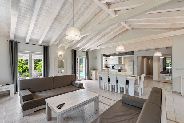 Zarte lindgrüne Wände treffen auf cremeweiße Möbel: In der Villa Monet empfängt Sie ein leichter Landhausstil. Durch die helle Farbgebung wirken die Räume freundlich und sommerlich. Im Mittelpunkt des offenen Wohnbereichs steht der große Esstisch, an dem sich Familie und Freunde zu einem gemütlichen Plausch einfinden können. Über einen kühlen Fliesenboden geht es direkt in die komfortable Sofaecke mit dem Flat-TV und dem bildhübschen Kaminofen. Die weißen Fenster und Terrassentüren sowie die aufwendige Deckenbalken-Konstruktion umrahmen den Wohnbereich, der sich zur Küche hin öffnet. Maßgeschneidert fügt sich die kleine aber besonders feine Holz-Küche in das Wohnkonzept ein. Dabei verfügt sie über jegliche Schikanen, die es für einen bequemen Aufenthalt braucht – von der Mikrowelle, über die Spülmaschine bis zum Cerankochfeld und dem Komfortkühlschrank in angesagter Retrooptik gibt es alles, was das Urlauberherz höherschlagen lässt.