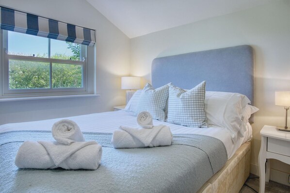 The Utility Room is conveniently located and features a washing machine, a fridge/freezer, and additional cupboard space with a door leading to the back garden. The Downstairs Shower Room is tastefully tiled and features a shower cubicle, a WC, and a wash hand basin. The first floor of the cottage features four comfortable bedrooms, including a spacious Master Bedroom with a king-size bed and ample hanging and storage space.