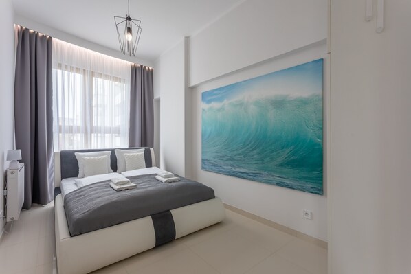 Es ist ein sehr geräumiges und luxuriöses Apartment im ersten Stock mit zwei großen Schlafzimmern, einem Ankleidezimmer, einem Wohnzimmer mit einer gut ausgestatteten Küchenzeile und einem Badezimmer. Seine Gesamtfläche beträgt 70 m2. Die nutzbare Fläche wird durch den Balkon erweitert, wo Sie angenehme Momente verbringen können, während Sie eine Tasse frisch gebrühten Kaffee oder ein Glas Ihres Lieblingsweins genießen.