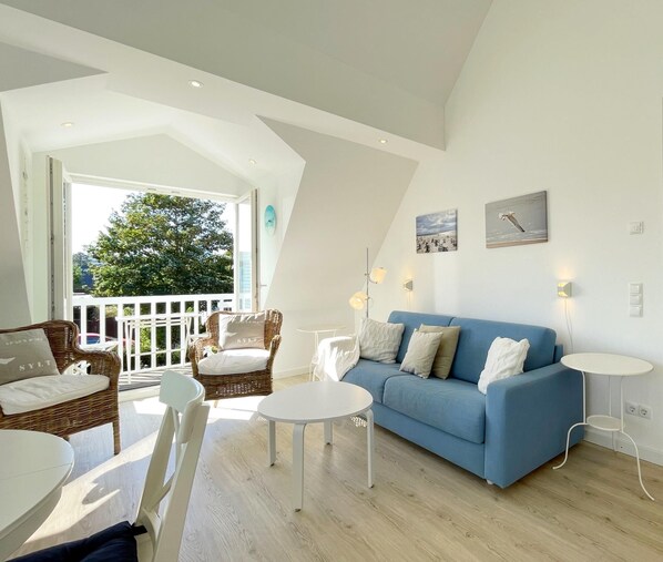 Sie finden hier einen gemütlichen, sehr modernen Wohnbereich mit Esstisch, bequemem Sofa, Flachbild-Fernseher.